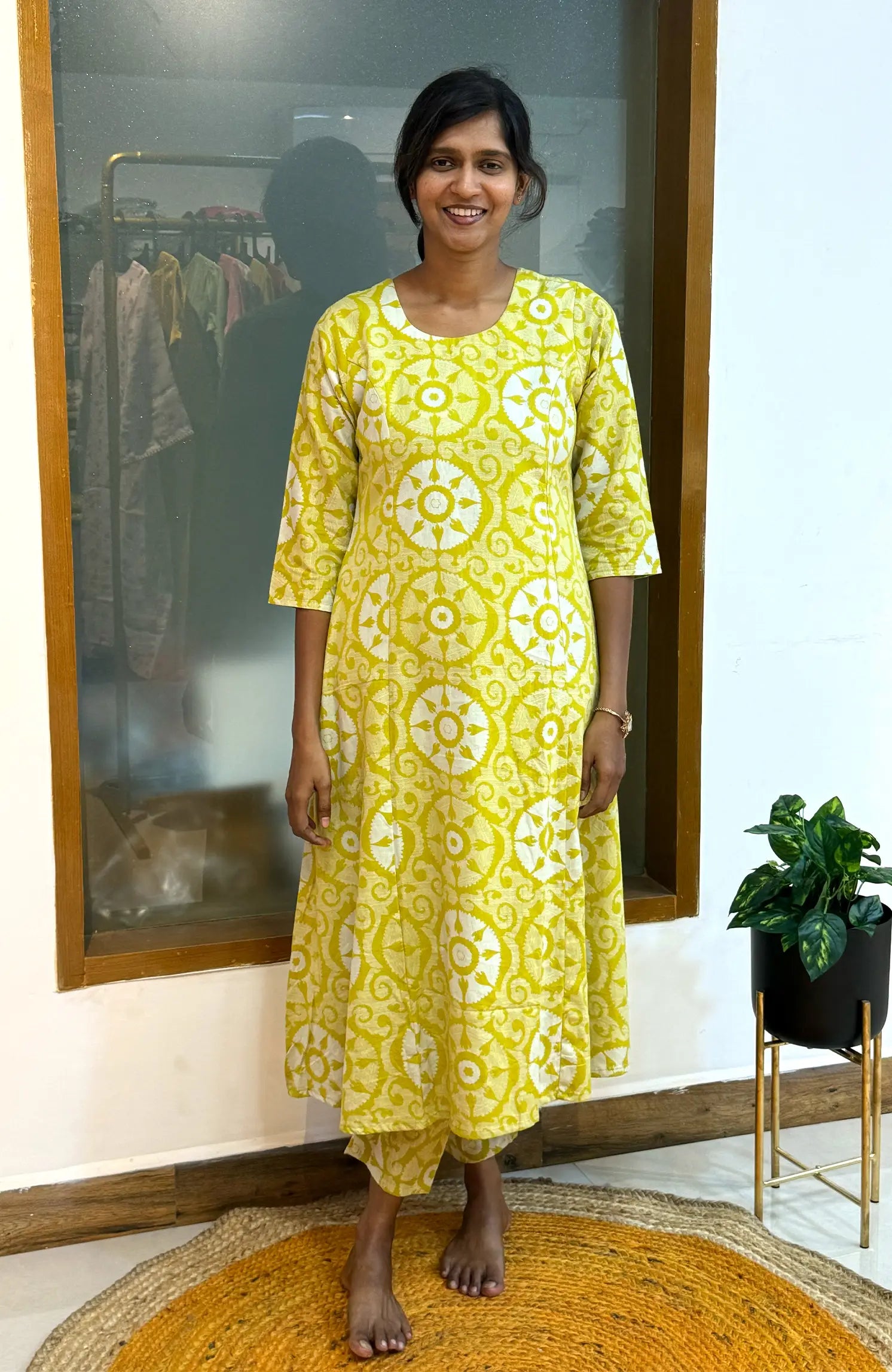 Step into cool, effortless style with the Ajrakh Scene Lime 524A — a trendy soft cotton set crafted for ultimate comfort. The A-line top with a practical pocket paired with straight-fit pants creates a relaxed everyday look, enhanced by Ajrakh-inspired designs in a refreshing lime tone.