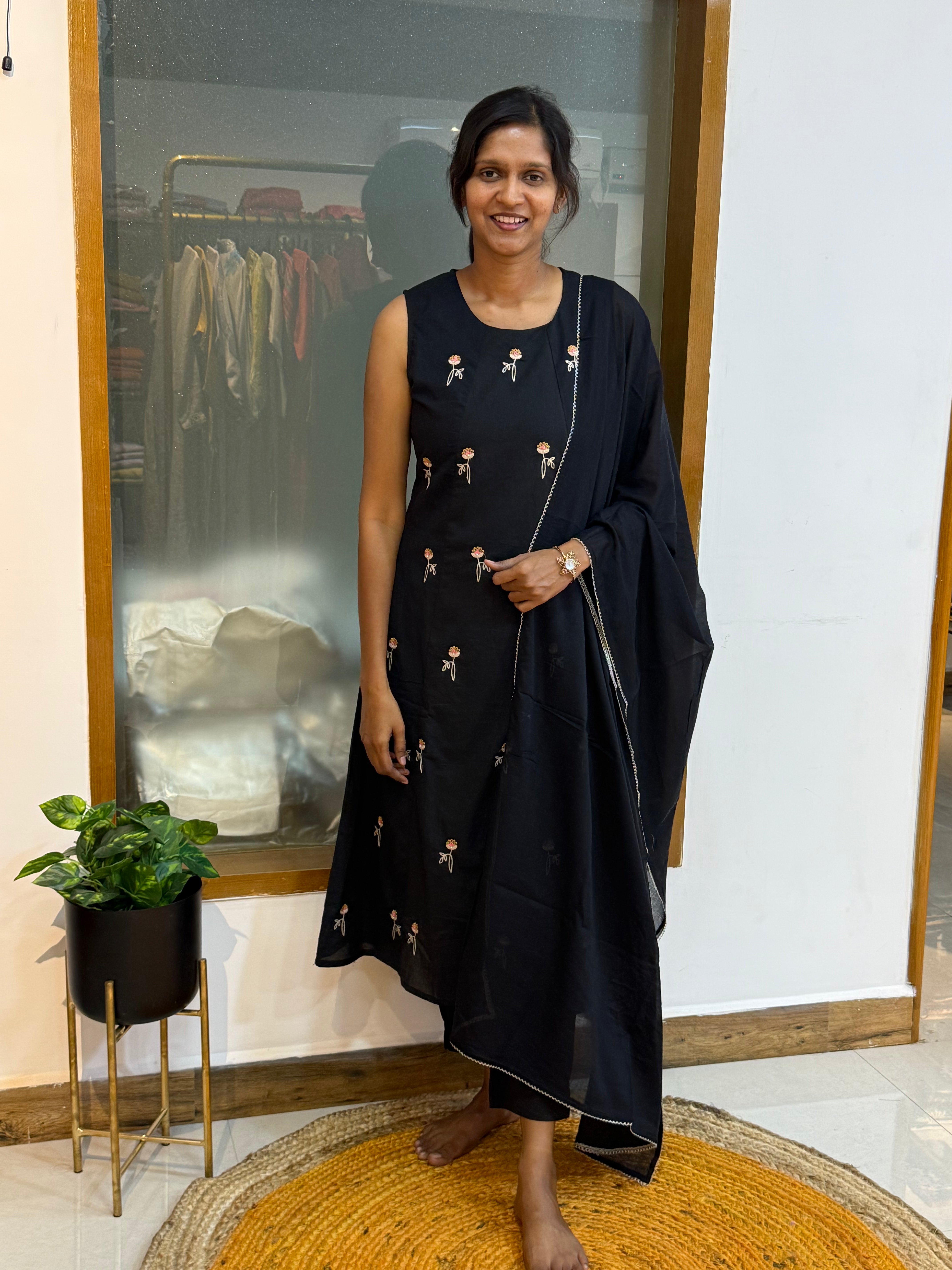 Beautifully embroidered with cute little florals, the ensemble is further elevated by a cotton dupatta detailed with tiny tots of silver lace.