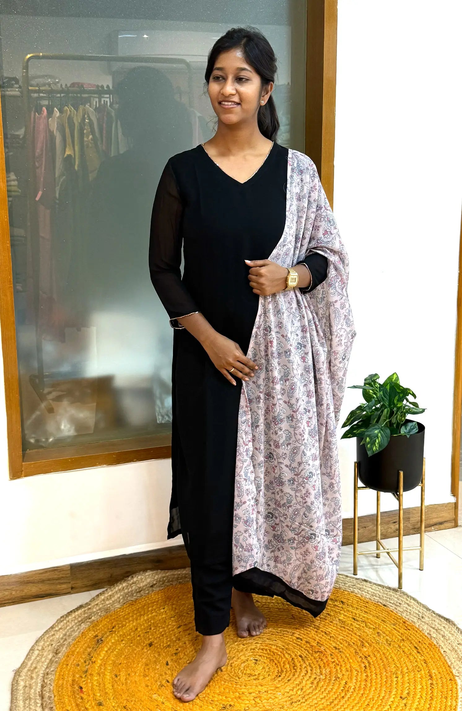 With its soft georgette fabric, chic monochrome tone, twinkling lace accents, and contrast printed dupatta, the Black Dude set is an ideal blend of comfort and modern style.