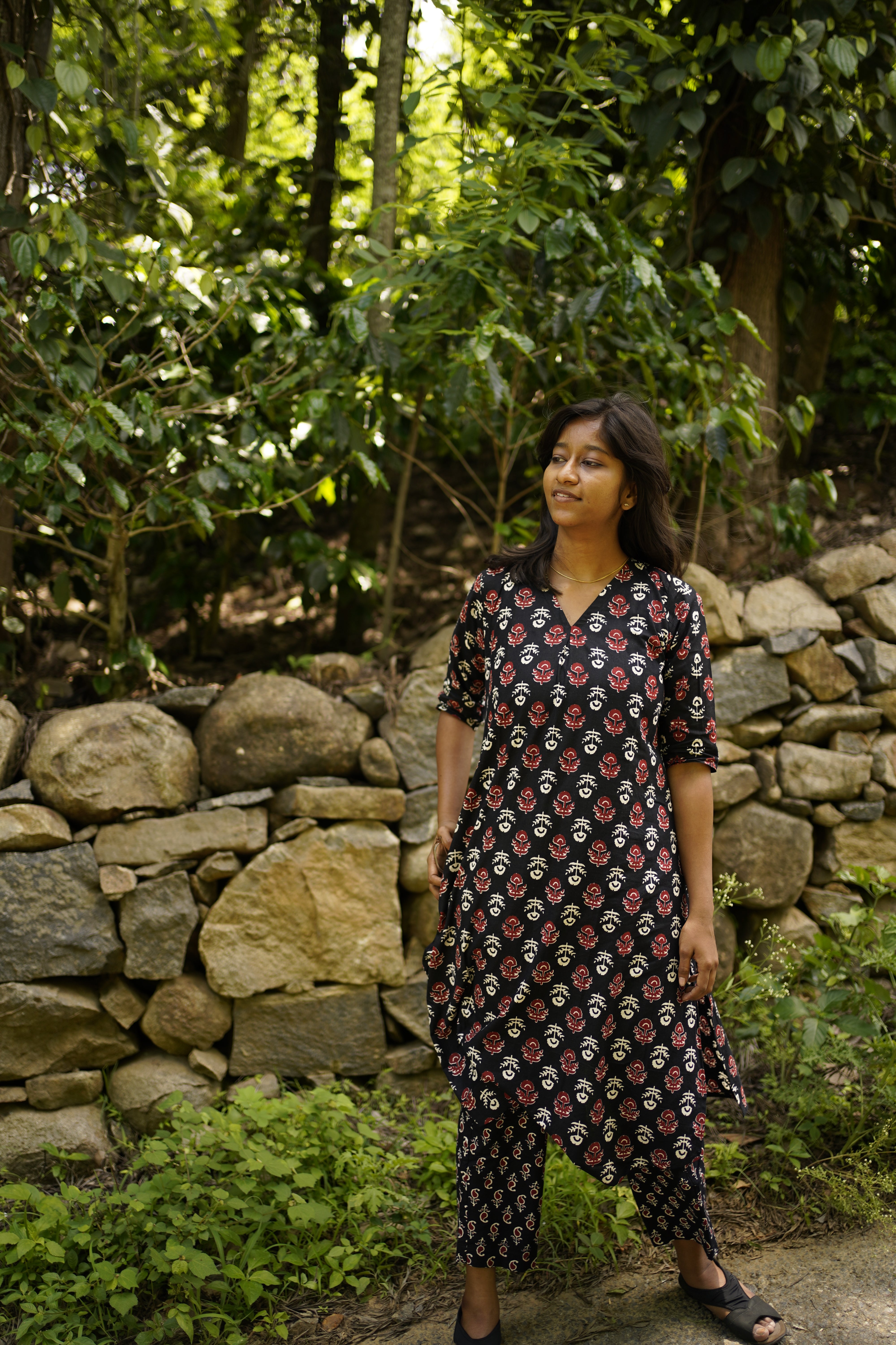 Experience the striking contrast of our "Black-Red Block Duo" ensemble, made from 100% cotton for unmatched comfort. This stylish set features an apple-cut top with parallel pants, creating a chic and modern look.