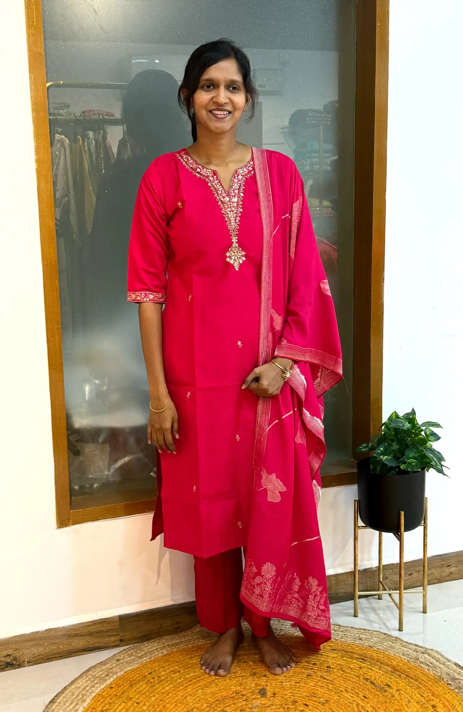 Elegant, timeless, and exquisitely detailed — Classic Vogue 592 is designed for classic party wear with effortless sophistication. Made from premium Vertican, this ensemble features a straight-cut top paired with straight pants and a Brazzo engraved dupatta. The U-V neckline and delicate embroidery using antique threads enhance its classic charm, while the 3/4th sleeves provide comfort for all-day elegance.