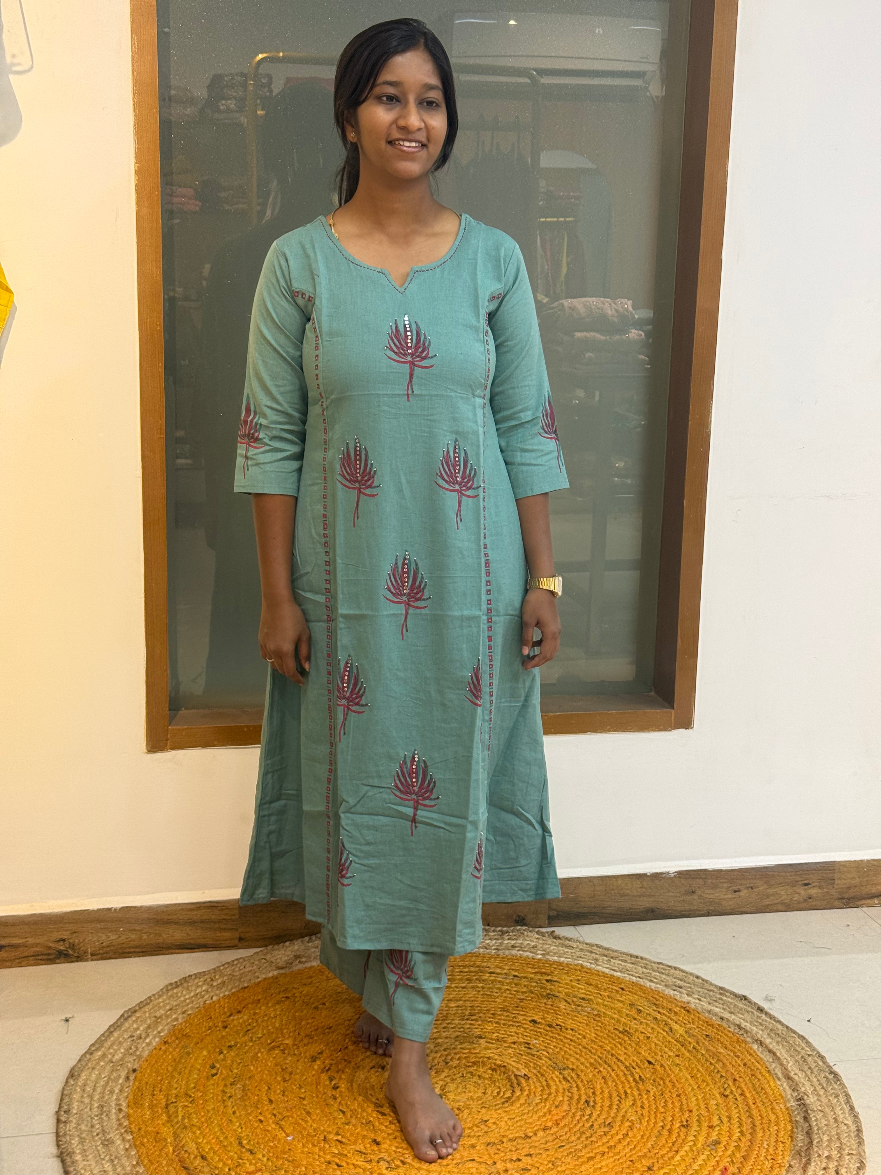 A breezy and charming cotton co-ord set designed for effortless everyday elegance. With its beautiful contrasting prints and subtle sequin embroidery, this set brings together comfort and style in the most graceful way.