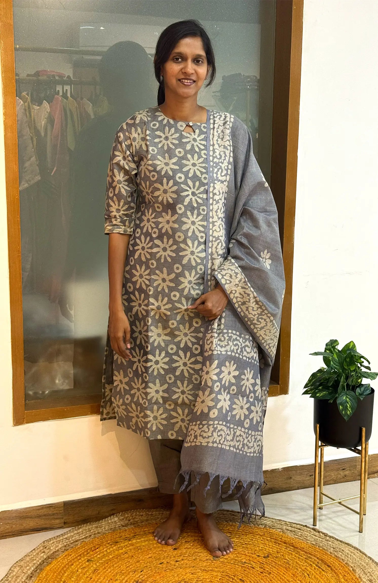 Make a subtle statement with Elephant Gray Blocks 557C — a refined jute-cotton set crafted for a polished and elegant ethnic look. Designed with classic block prints and a straight-cut silhouette, this outfit offers breathable comfort and a graceful finish, making it perfect for casual office wear and everyday sophistication.