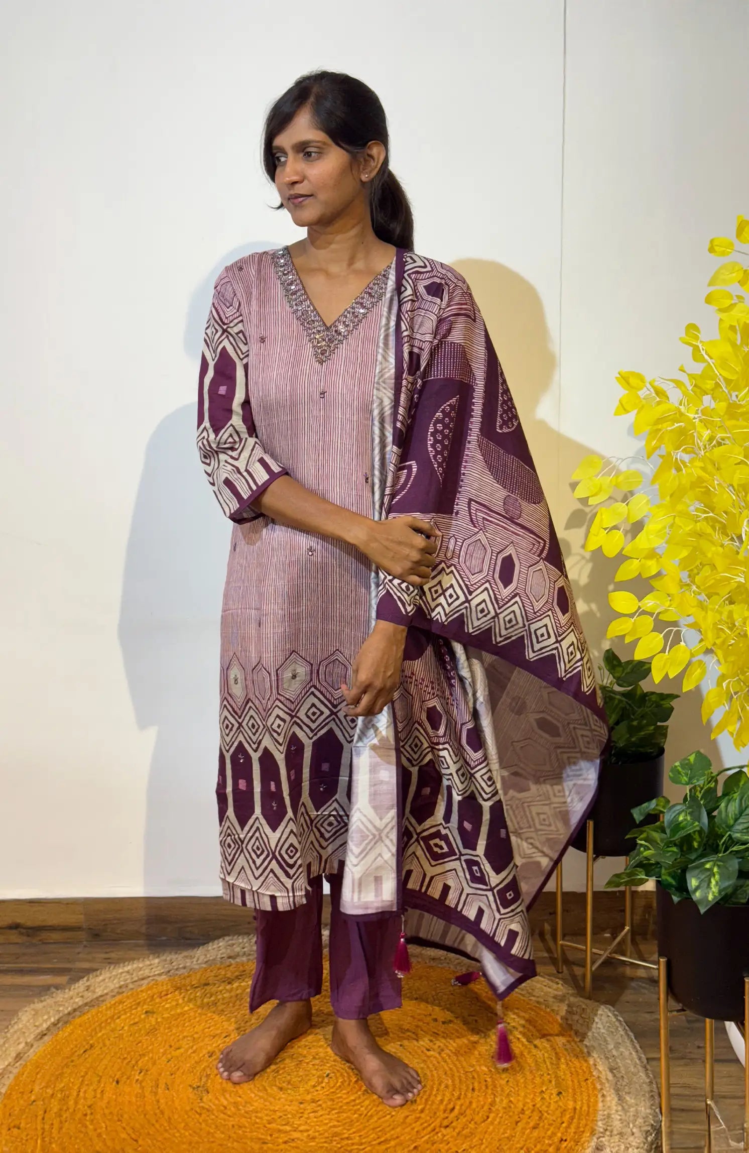 “Geometric Fantasy – Magenta 505B” celebrates the beauty of timeless embroidery and digital artistry — perfect for festive wear, family gatherings, or elegant daytime outings.