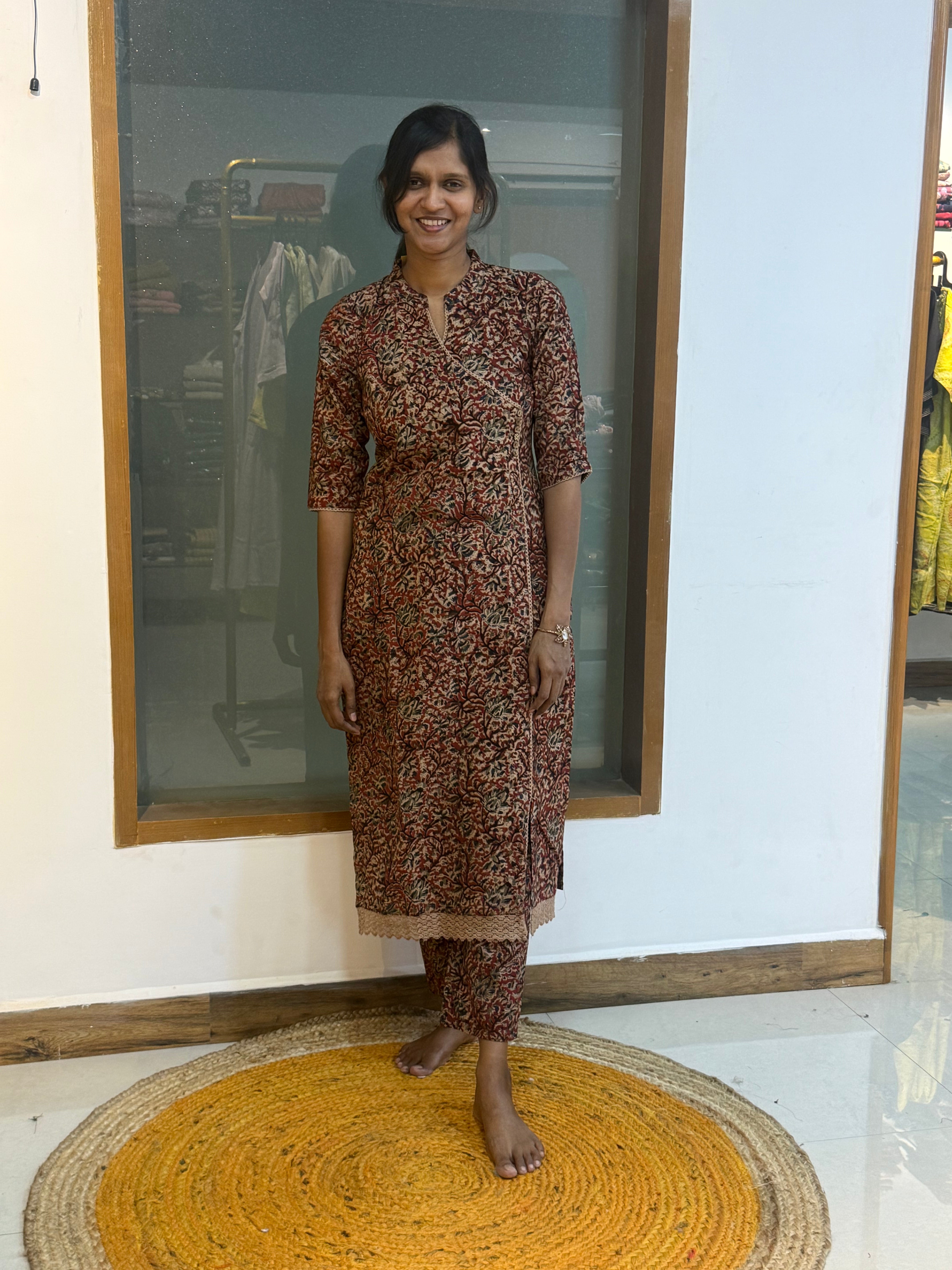 A charming Kalamkari cotton co-ord set crafted from naturally dyed fabric that reflects timeless tradition and earthy elegance. Designed with a stylish collared neck in an Angrakha pattern, the straight cut top offers a neat and graceful silhouette. Paired with straight pants featuring a convenient pocket, this set blends comfort with everyday practicality. Attractive lace detailing adds a delicate touch, gracefully enhancing the overall look. Soft, breathable and extremely comfortable, this co-ord set is a must-have essential for effortless everyday ethnic wear.