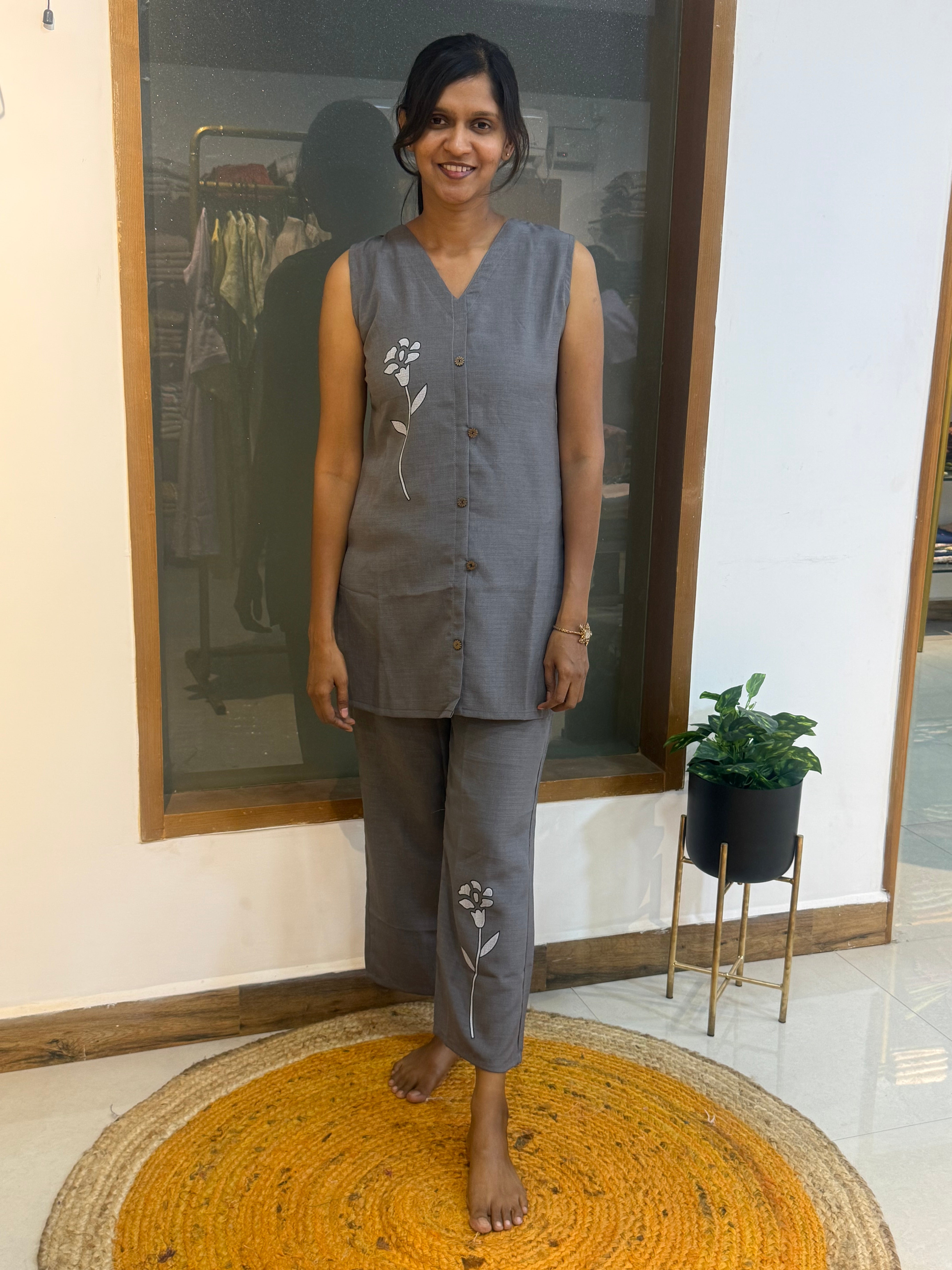 A graceful co-ord set crafted in a soft synthetic–viscose blend, designed for everyday ease and style. Featuring a beautiful modern floral print on a soothing grey base, the top is styled with a flattering V-neck and a sleeveless silhouette layered with attached elbow-length sleeves for a unique look. Paired with comfortable bottoms, this set offers a light, relaxed feel—perfect for effortless everyday dressing.