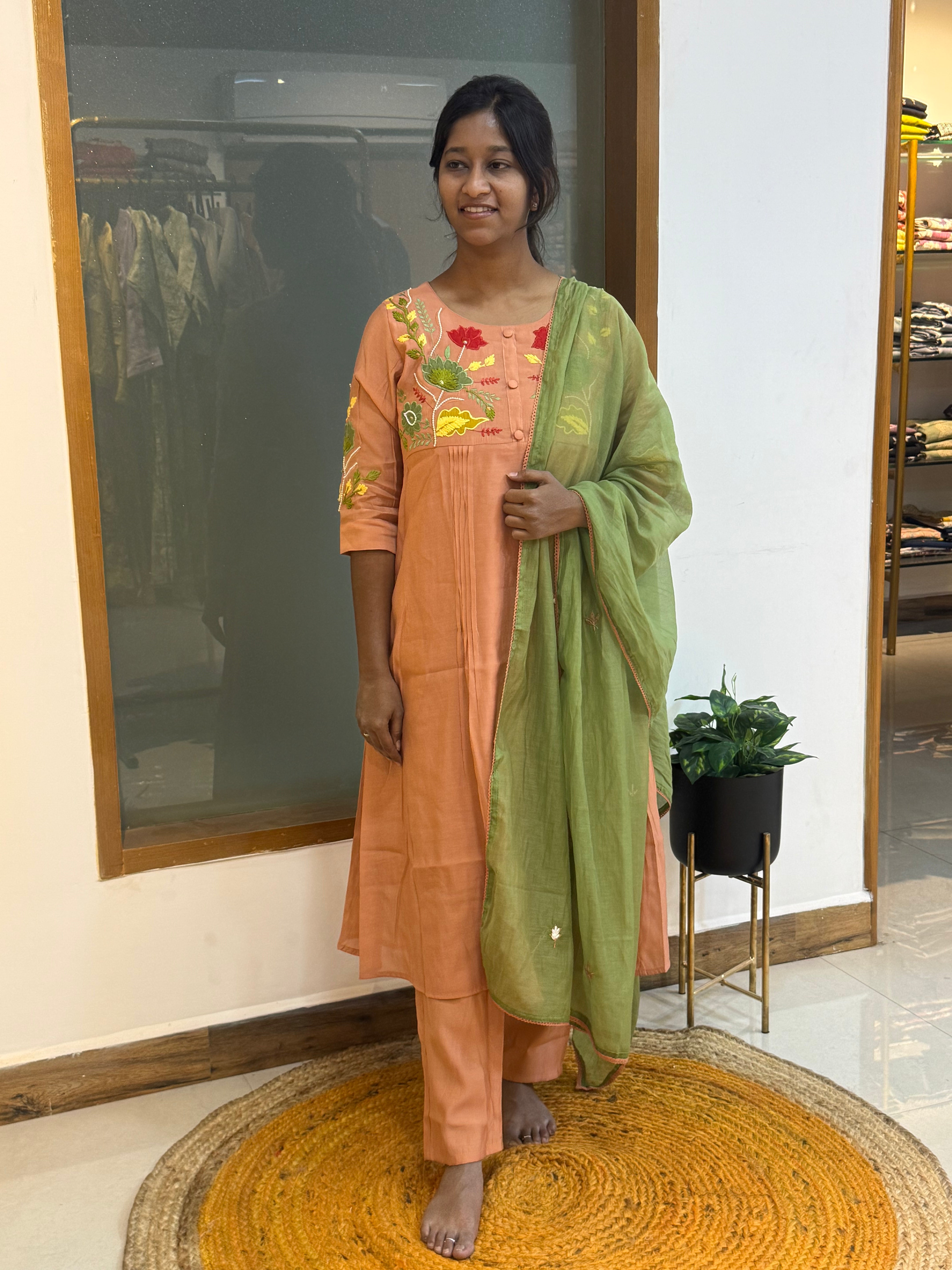 Step into effortless elegance with this beautifully crafted Mul Chanderi set, designed for graceful occasional wear. The breathable and lightweight fabric ensures all-day comfort while keeping your look refined and stylish.