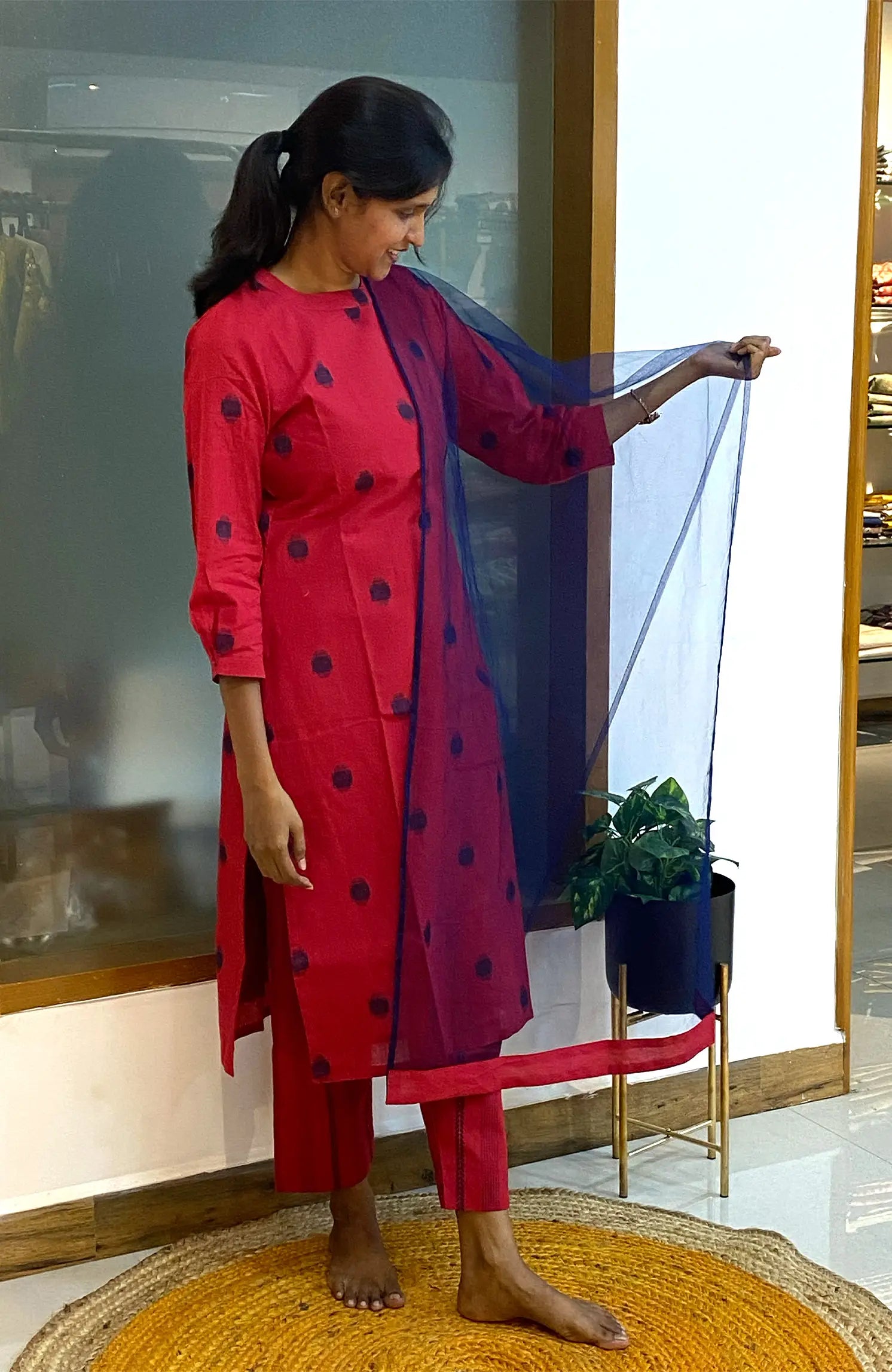With its clean neckline, puff sleeves, breathable handloom cotton, and airy netted dupatta, Red Weave brings effortless charm and comfort to your wardrobe.