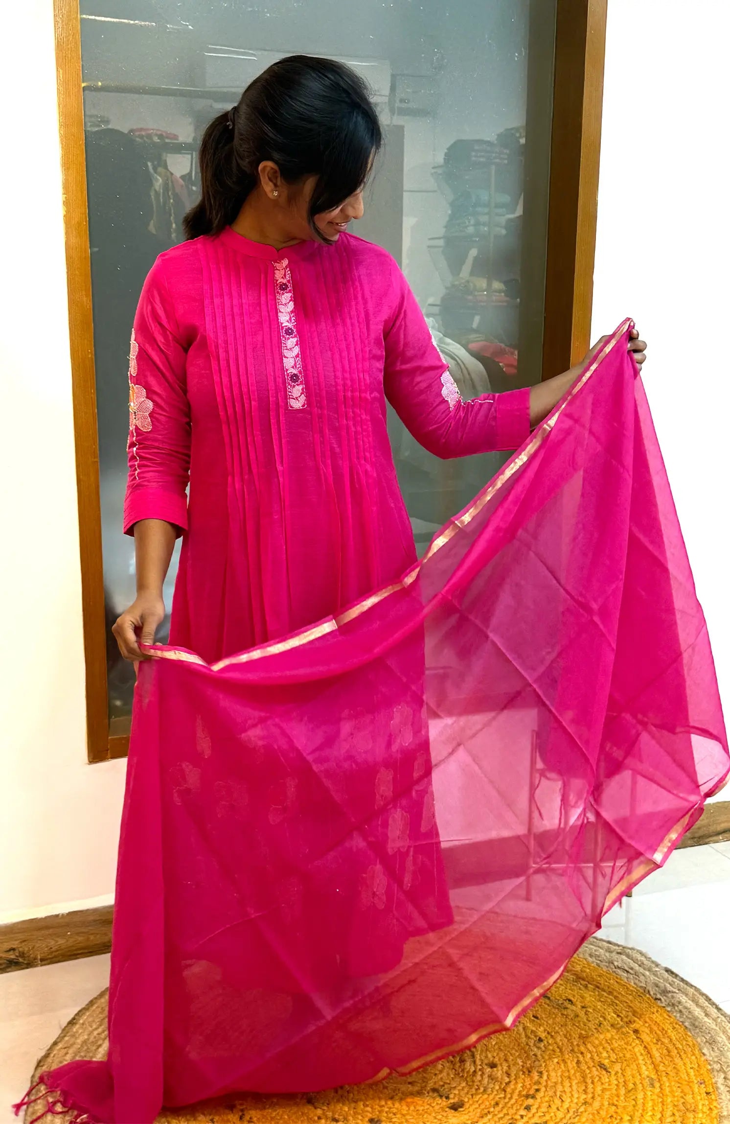 Graceful, elegant, and beautifully detailed — Rose Garden 590 is crafted for standout occasional wear. Made from premium mul chanderi, the top features a gentle flare paired with straight pants for a polished silhouette. Enhanced with attractive embroidery on the sleeves and top hem and a close neck with collar, this ensemble exudes sophistication and charm.