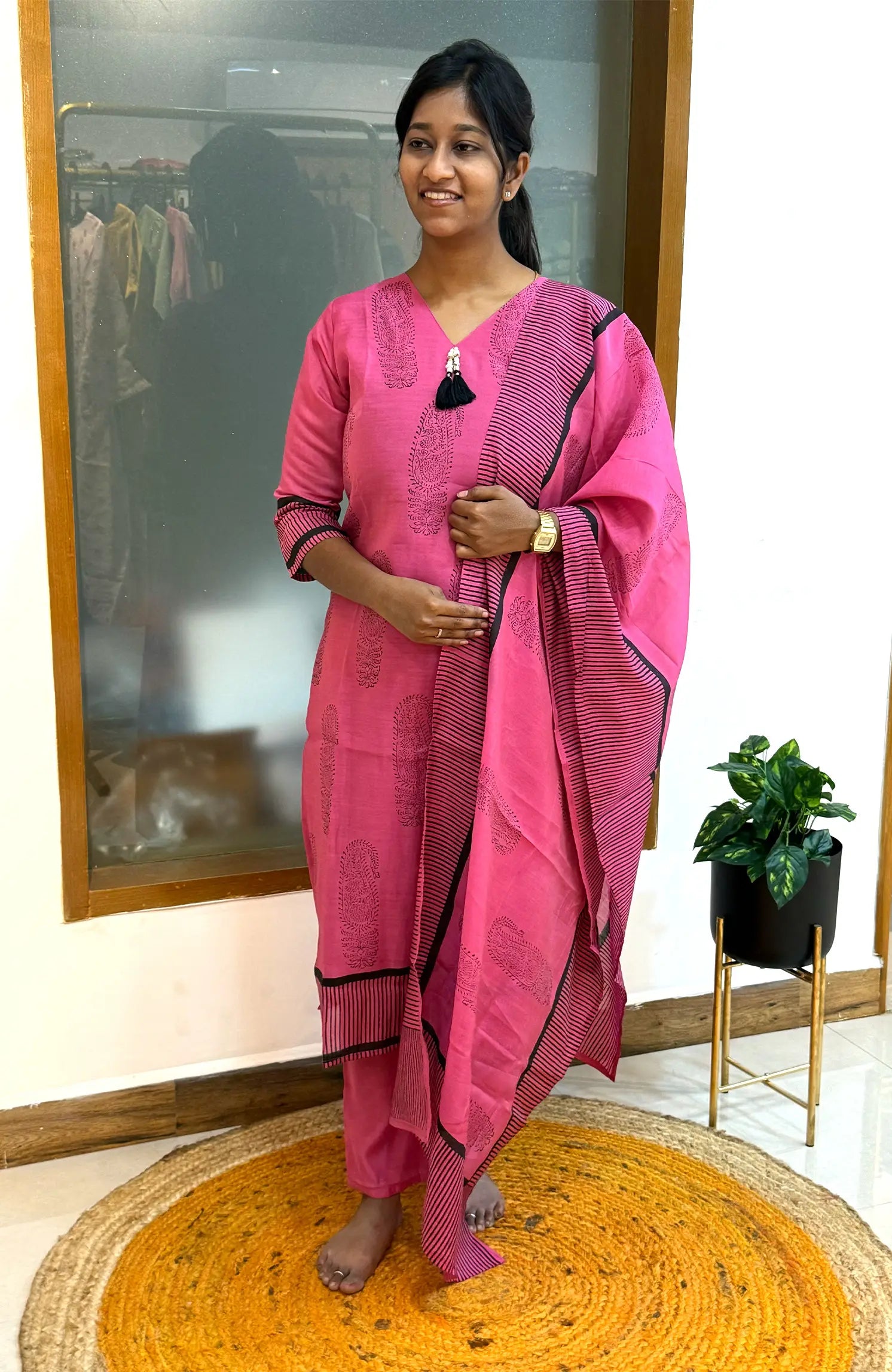 Experience elegance in its purest form with Royal Rare 563 — a stunning mul chanderi set enriched with a soft lining for comfort. This outfit features a beautiful monochrome royal rose tone paired with exquisite handblock prints, creating a chic, refined, and trending look from top to bottom.