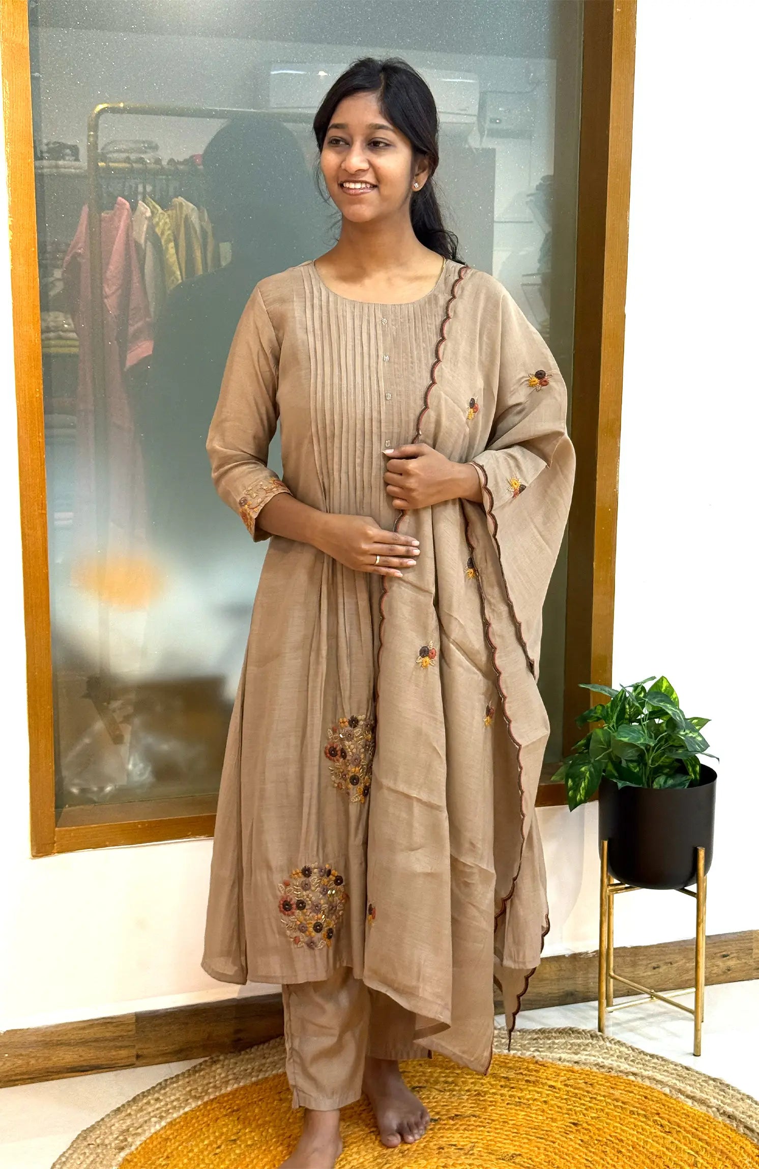 Elegant, timeless, and beautifully crafted — Silent Charms is a mul chanderi ensemble designed for refined, effortless grace. With its A-line top, straight pants, and delicately scalloped dupatta, this outfit blends comfort and sophistication, making it a perfect choice for occasions that call for subtle elegance.