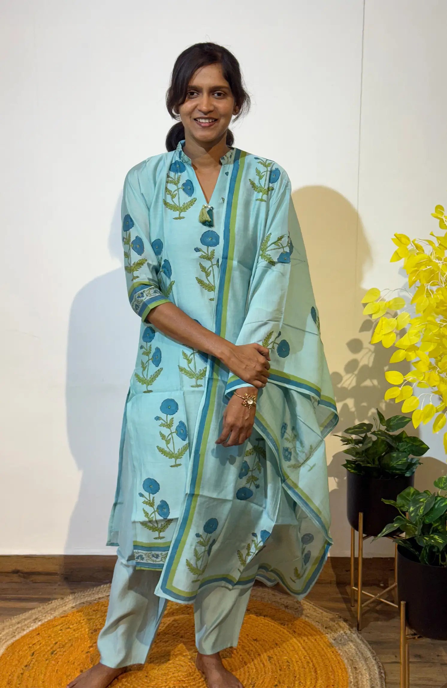 Discover the calm elegance of "Soft Hue Blocks – Blue 498B" — a 3-piece set designed to embody serenity and sophistication. Crafted from mul chanderi fabric with a soft cotton lining, this ensemble offers a light, airy feel that’s perfect for warm days and refined occasions.