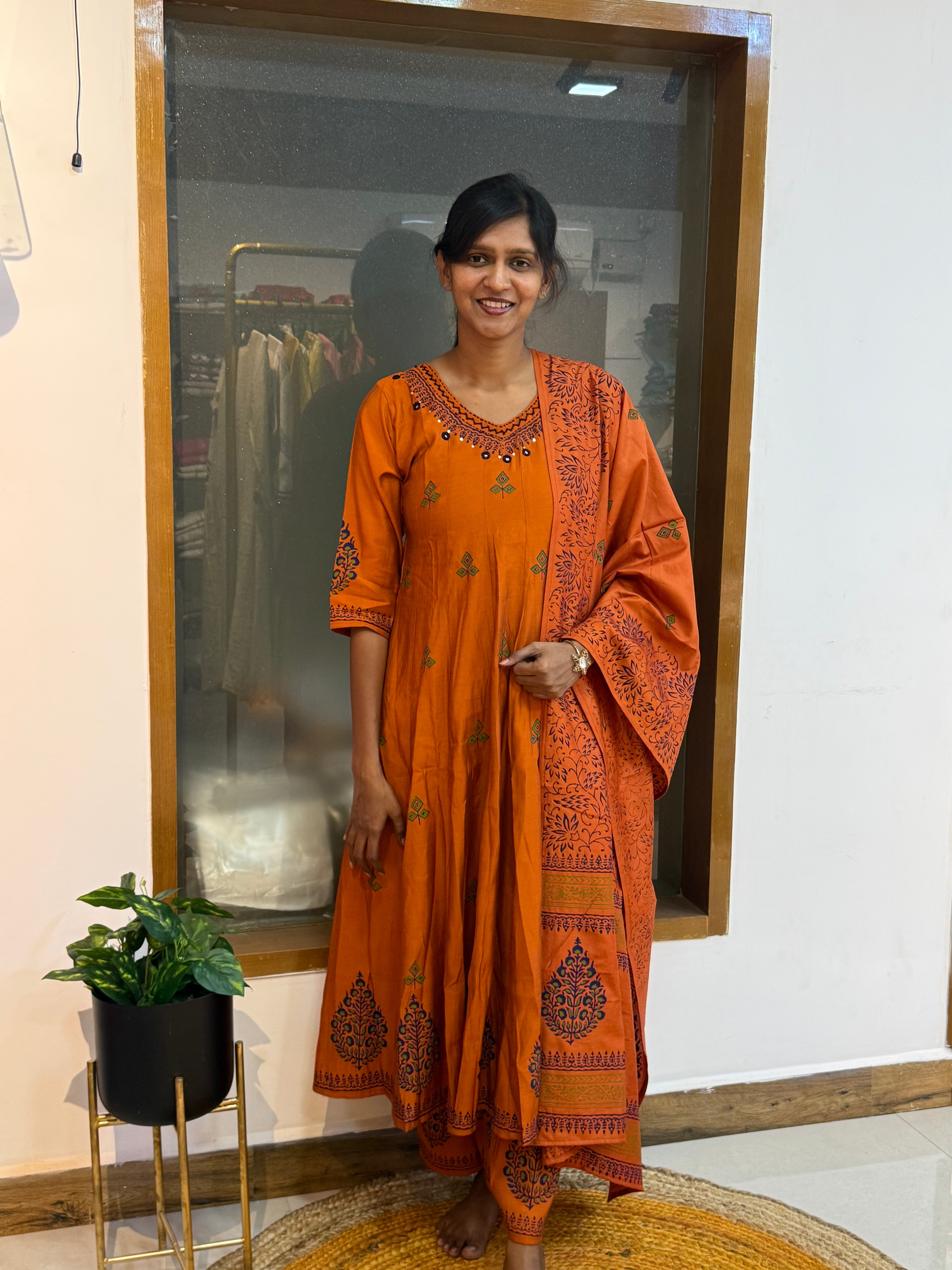 This beautiful Anarkali style 3-piece set is crafted in luxurious mul chanderi fabric, showcasing rich traditional colours of dark orange and navy blue.