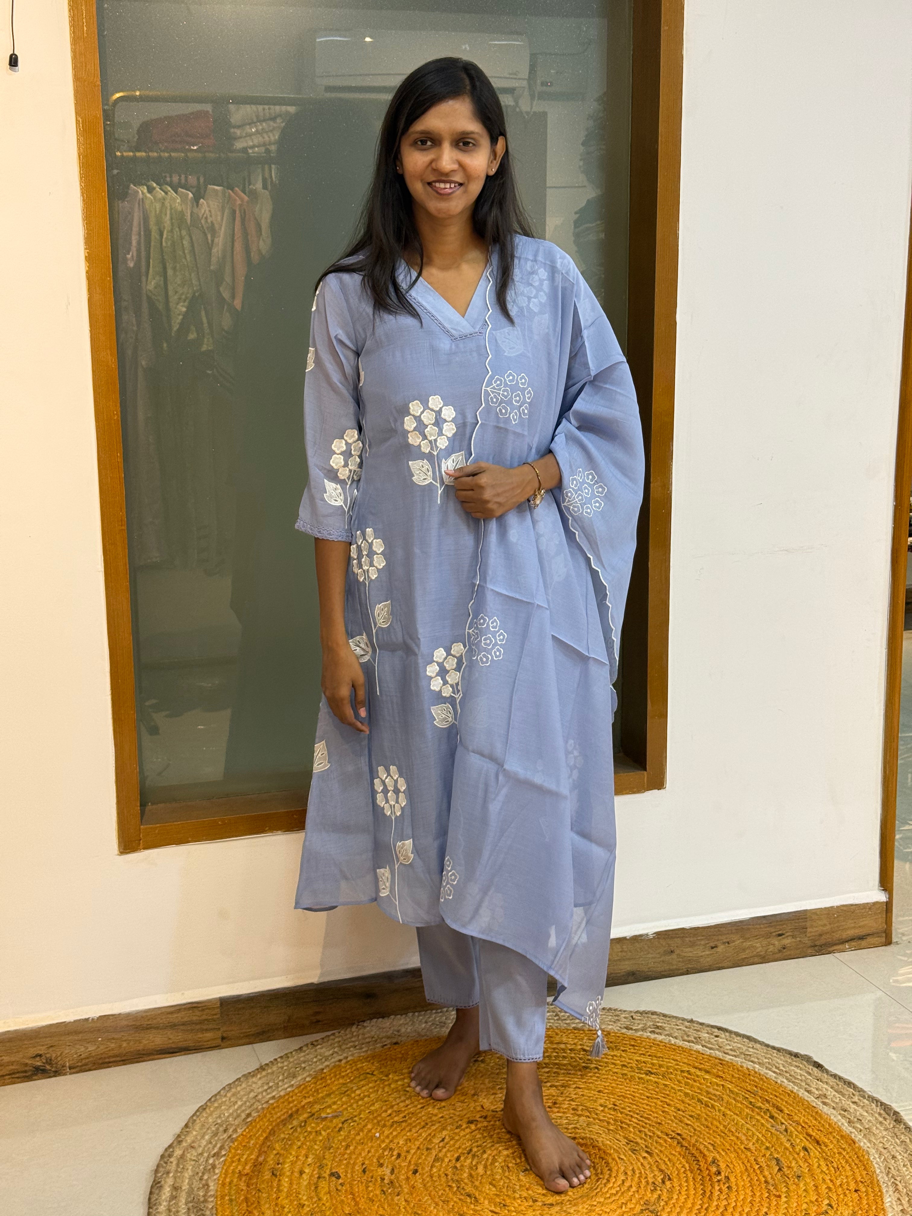 Presenting Vidhula – a pure mul chanderi set that reflects understated elegance and refined craftsmanship. Adorned with lovely soft white appliqué work, this ensemble brings a serene and graceful charm to your wardrobe.