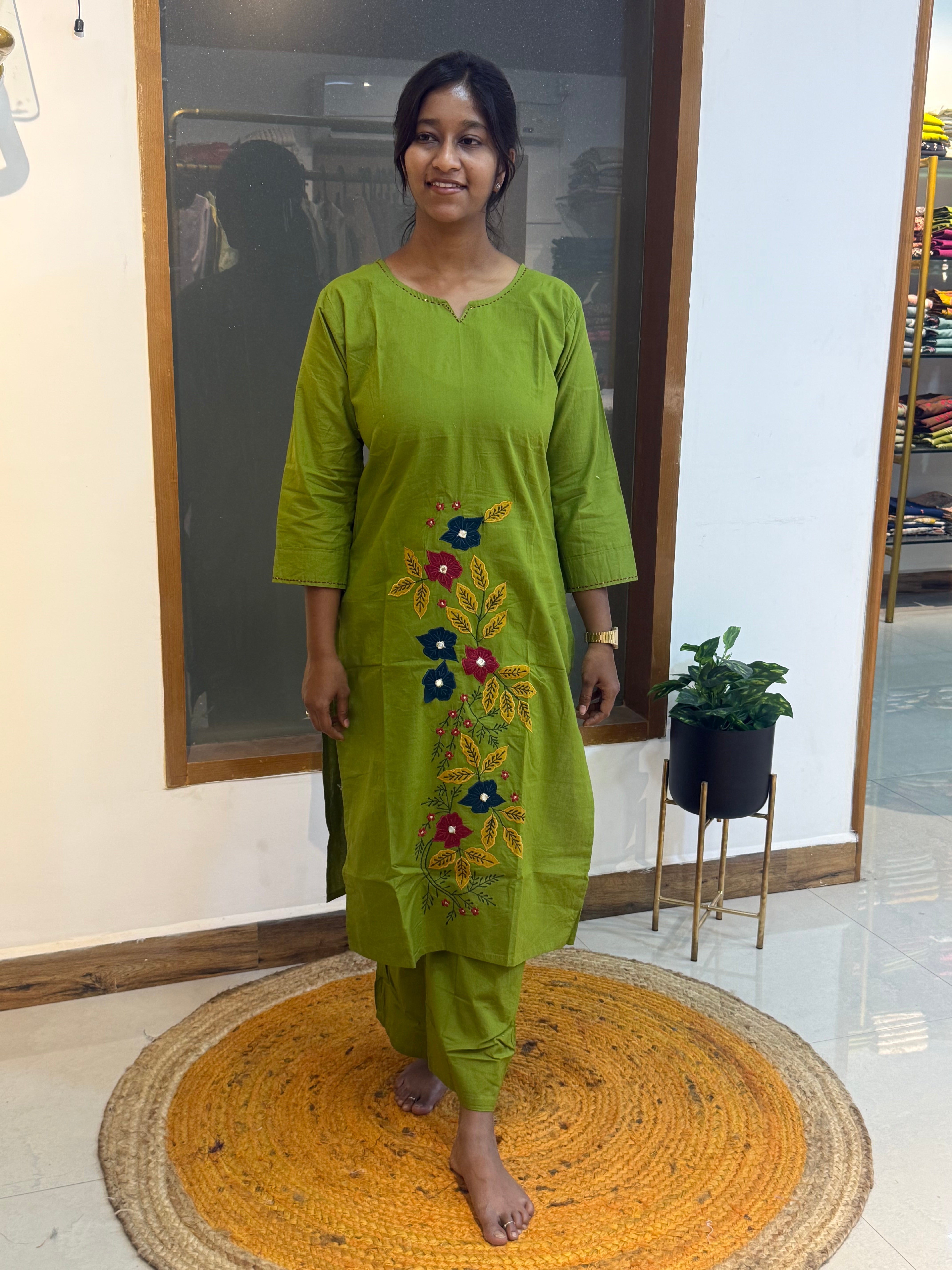 Add a vibrant touch to your everyday wardrobe with this bright green kurta set. The straight-cut top features a flattering V-neck adorned with colourful sequin embroidery that adds just the right hint of sparkle. Paired with comfortable palazzo pants, this set blends ease and elegance—perfect for relaxed, casual days.